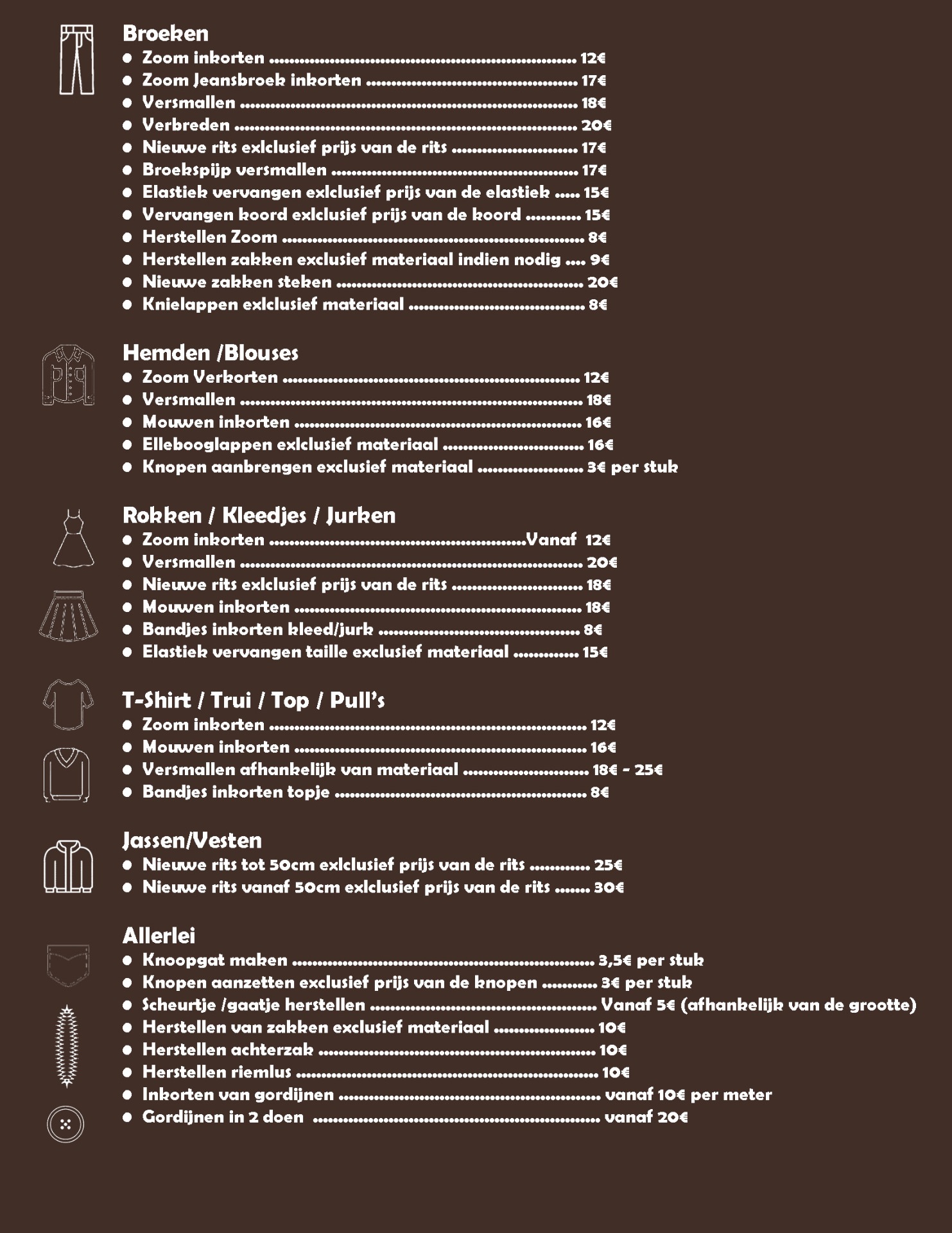 Omwille van hygiënische redenen, gelieve de kledingstukken voor herstellingen/Retouches steeds proper en gewassen te willen brengen aub.
